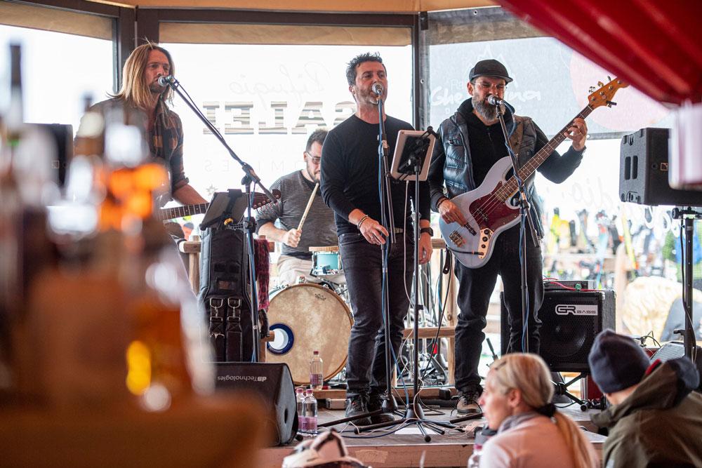 Not that a trip to the Dolomites is all about snowboarding though, as we found out the next day when we headed to the pistes in search of the Rock the Dolomites festival. A week-long music event that features a different act performing each day somewhere in the ski area. The final day saw me searching for the Rifugio SALEI Hütte, situated at a height of over 2000 metres and framed by the Sella Pass. The hotel is normally renowned as a relaxing wellness hotel, but today the serene ambiance was shattered by the sounds of Temporaneamente, who delivered a mixture of rock and grunge, closing out the festival in style. It was the perfect way to spend an afternoon, enjoying a couple of drinks in the spring sun before tackling the slopes back to town. We only wish we had done the whole festival!